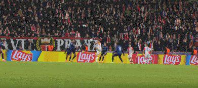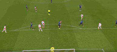 32’角球進攻中,加布里埃爾頭球攻門,普羅沃德手球犯規,薩卡罰入點球,阿森納1比0。