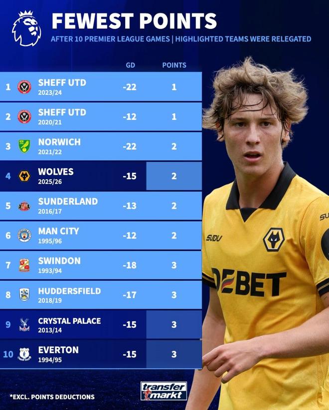 北京時(shí)間11月3日,來自德轉(zhuǎn)的統(tǒng)計(jì)指出,狼隊(duì)本賽季英超前10輪過後僅積2分,凈勝球-15的成績?yōu)橛⒊瑲v史聯(lián)賽同期第三差的成績。在這份榜單中,除狼隊(duì)以外,排名前八的球隊(duì)當(dāng)賽季都最終降級。