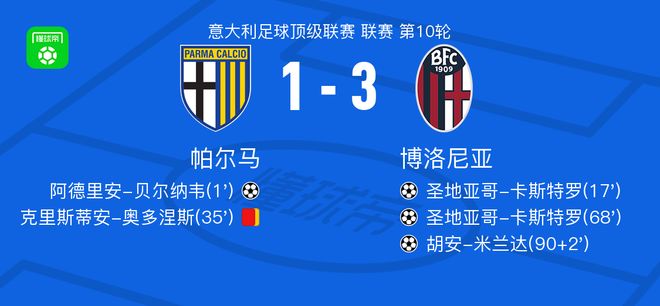 北京時間11月3日意大利足球頂級聯賽 聯賽 第10輪,帕爾馬主場對陣博洛尼亞。帕爾馬阿德裡安-貝爾納韋破門。博洛尼亞聖地亞哥-卡斯特羅梅開二度,胡安-米蘭達破門。最終比分帕爾馬 1-3 博洛尼亞。