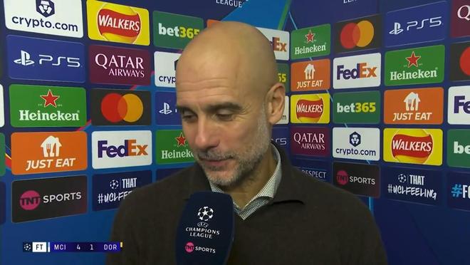 率隊在歐冠聯賽階段第4輪主場4-1大勝多特蒙德之后,曼城主教練瓜迪奧拉接受了來自TNT體育的采訪。