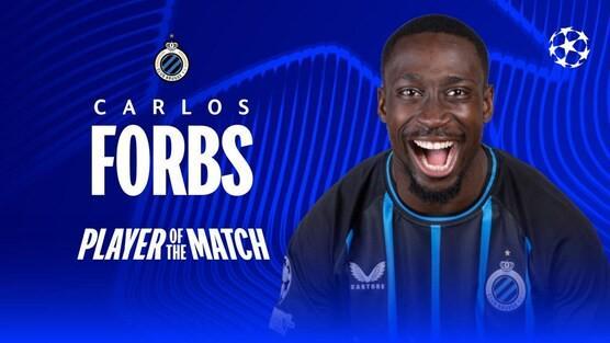 歐冠聯賽階段第四輪,布魯日主場3-3戰平巴塞羅那,此役貢獻2球1助的布魯日前鋒卡洛斯-福布斯當選歐冠官方全場最佳球員。