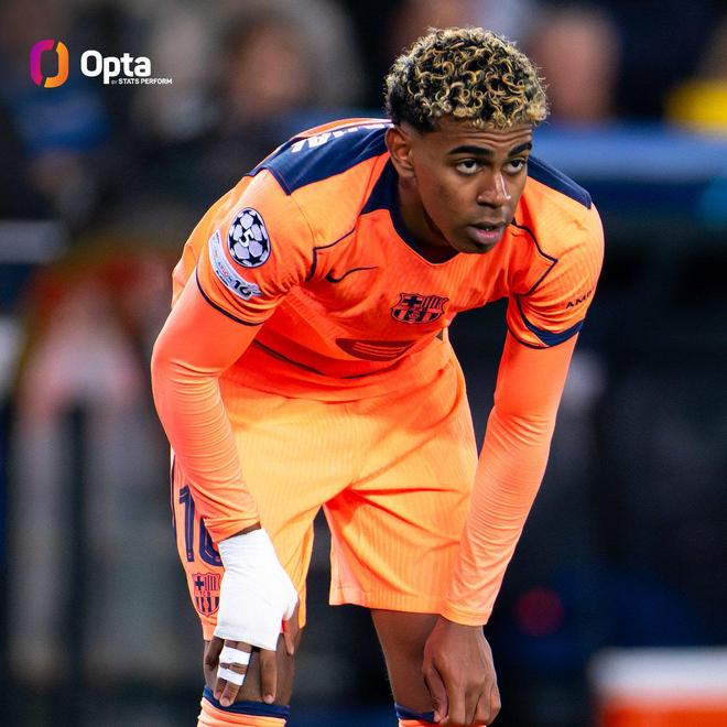 此役對陣布魯日打入一球后,18歲的亞馬爾在歐冠聯賽中已直接參與了13個進球(7個進球,6次助攻)。