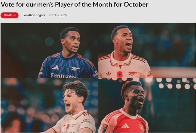 官方:阿森納宣佈廷貝爾、加佈裡埃爾、賴斯和薩卡被提名為瞭隊內10月份最佳球員候選。