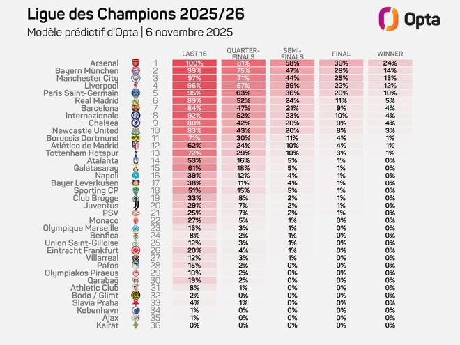 北京時(shí)間11月6日,在歐冠聯(lián)賽階段第4輪的比賽結(jié)束後,Opta預(yù)測(cè)瞭36支參加球隊(duì)晉級(jí)16強(qiáng)、1/4決賽、半決賽、決賽以及奪冠的概率。