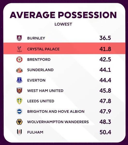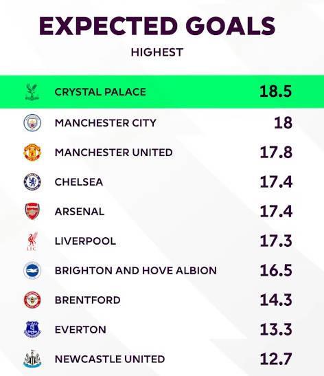本賽季英超已經進行瞭10輪比賽,根據英超官方的統計數據,水晶宮是本賽季至今平均控球率第二低的球隊,但他們的預期進球數最高。