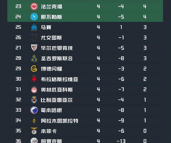而其他意甲球隊(duì)就沒有那麼出色的成績(jī)瞭,亞特蘭大4輪過後7分排在第16,已經(jīng)是僅次於國(guó)米之後的最好的成績(jī)瞭。至於上賽季的意甲冠軍那不勒斯,不僅上輪被荷甲的埃因霍溫爆錘瞭一個(gè)6:2,而且4輪4分排在第24,卡在附加賽的區(qū)域。而尤文圖斯4輪過後更是沒有獲勝,第26名位列淘汰賽。