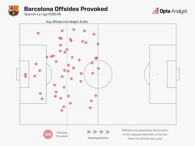 本賽季西甲賽場,巴薩制造越位的位置平均距離自家球門31.6米,相比2024-25賽季的33.8米略向內收。上賽季,這一平均距離比西甲其他所有球隊都遠出2米,位居聯賽第一;而本賽季,他們在這一數據上落后于皇馬(34.6米)和馬競(32.6米),但制造的越位次數卻分別比這兩支球隊多了46次和44次。