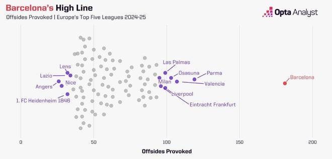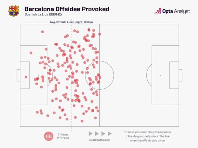 巴薩在西甲和歐冠賽場的相關數據存在顯著差異:歐冠中,他們制造越位的位置平均距離自家球門僅22.2米。但必須指出的是,他們目前只踢了4場歐冠比賽,且這一平均值受對陣紐卡斯爾聯和巴黎圣日耳曼的比賽影響較大,7次制造越位中有5次來自這兩場對決。
