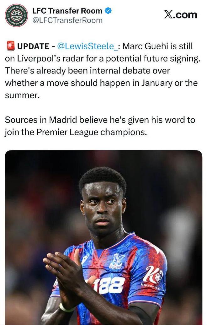 斯蒂爾:格伊仍然在利物浦的雷達上,仍可能在未來簽下他,至於轉會在1月還是夏季進行,內部已經存在爭議。而來自馬德裡的消息人士認為,他已經給瞭利物浦承諾。
