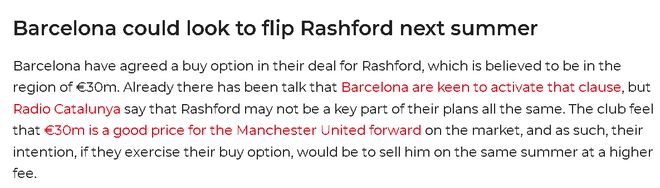 不過(guò),加泰羅尼亞媒體披露,巴薩高層有不同的想法,他們考慮買斷拉什福德,然後再把他高價(jià)賣出,以賺取差價(jià)。