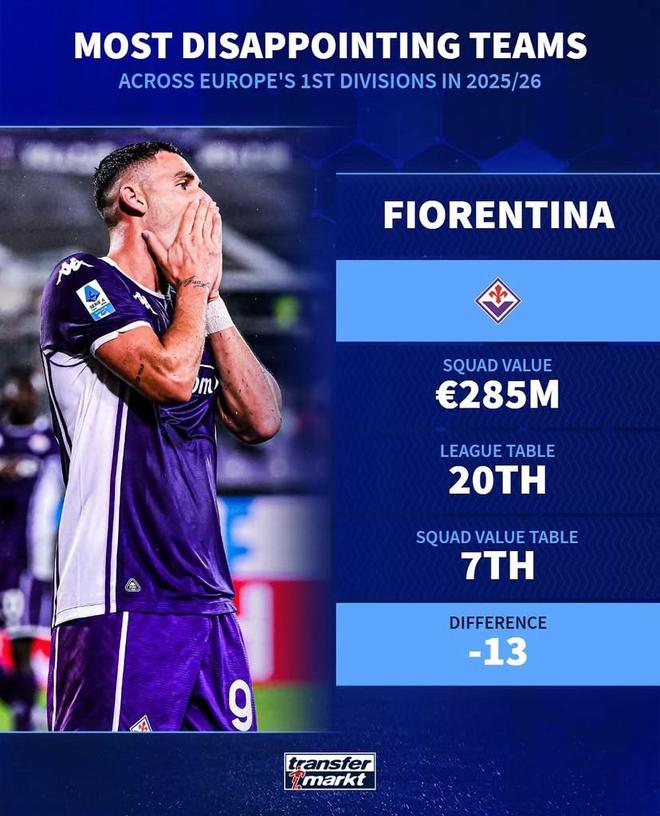 身價(jià)意甲第7位,積分意甲第20位,相差13位