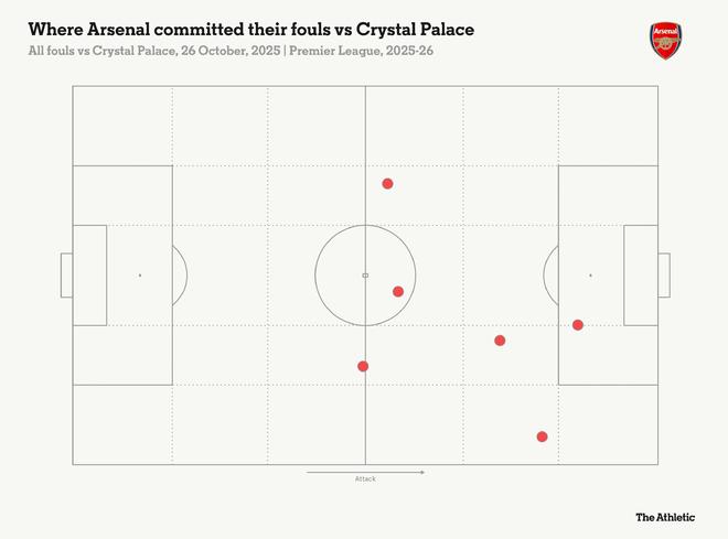 下圖中的圓點標示瞭阿森納在該場比賽中犯下6次犯規的位置。所有這些犯規都發生在水晶宮的半場。