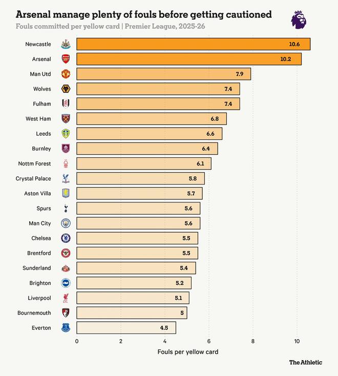 而本賽季同一時間點,盡管早期賽程艱難,阿爾特塔的球隊卻無人被罰下場,且僅收到10張黃牌。他們不僅領跑英超積分榜——在公平競賽榜上也名列前茅。