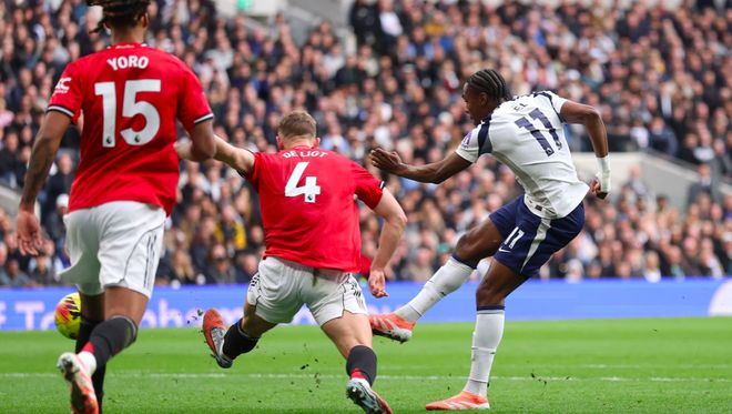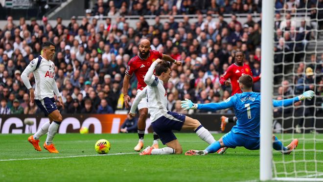 第31分鐘,熱刺後防出現失誤,曼聯立即開始強勢進攻,阿瑪德迪亞洛傳中,姆貝莫頭球攻門,維卡裡奧隻能目送皮球入網。