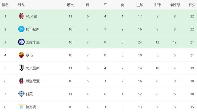 在積分榜上,AC米蘭登上瞭榜首位置。AC米蘭總積分達到22分,和那不勒斯積分相同,但在凈勝球一樣的情況下進球數占優,得以排名第1。不過,AC米蘭比那不勒斯多賽一場,分分鐘有可能被擠下去。國際米蘭以21分排名第3。羅馬也是21分,排名第4。尤文圖斯19分,排名第5。博洛尼亞和科莫都是18分,排名第6和第7名。