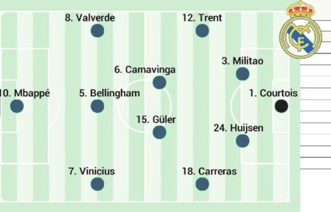庫爾圖瓦;亞歷山大-阿諾德、米利唐、赫伊森、阿爾瓦羅-卡雷拉斯;卡馬文加、居萊爾;巴爾韋德、貝林厄姆、維尼修斯;姆巴佩