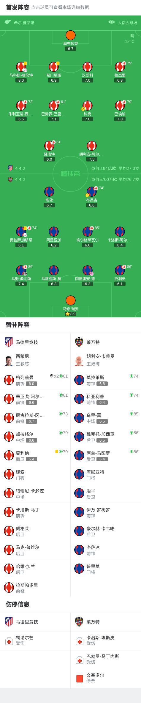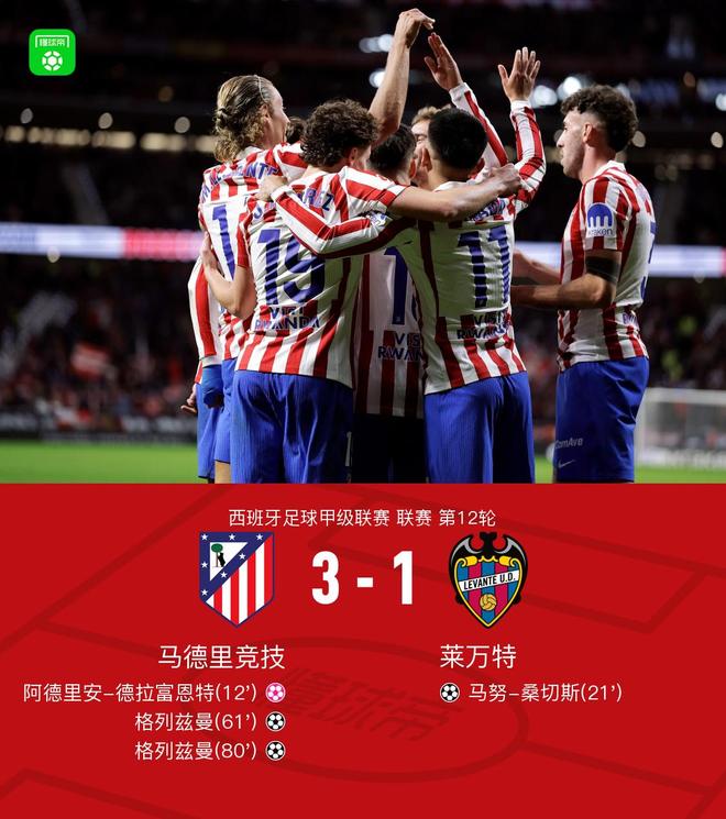 北京時間11月9日,西班牙足球甲級聯賽第12輪展開角逐,馬德里競技坐鎮主場迎戰萊萬特。上半場德拉富恩特門前不慎自擺烏龍,之后奧拉薩加斯蒂開出角球,馬努-桑切斯破舊主。下半場略倫特傳中,格列茲曼上場即破門,之后阿爾瓦雷斯射門被撲,格列茲曼補射破門完成雙響。最終馬競3-1戰勝萊萬特。