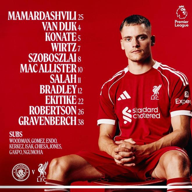 利物浦首發(fā):25-馬馬爾達(dá)什維利、26-羅伯遜、4-范戴克、5-科納特、12-康納-佈拉德利、10-麥卡利斯特、38-赫拉芬貝赫、8-索博斯洛伊、11-薩拉赫、7-維爾茨、22-埃基蒂克