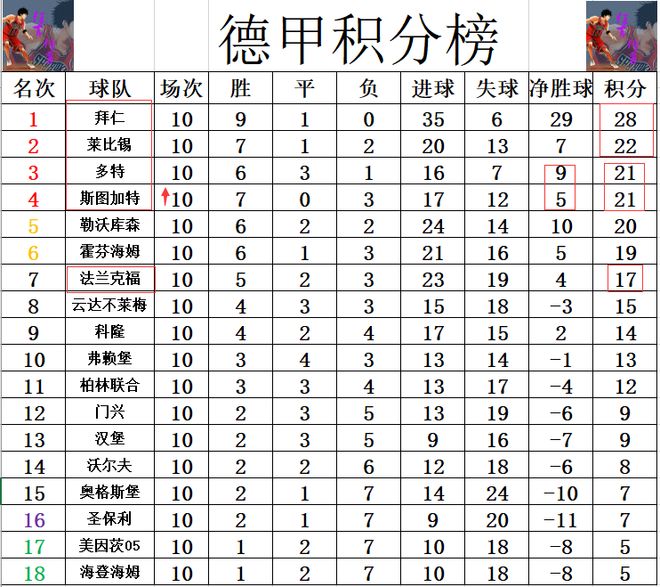 積分榜方面,拜仁本輪被終止了9連勝,不過他們的領先優勢還是比較大的,比第2名的萊比錫多了6分,比第3的多特多7分。斯圖加特今天逆轉絕殺贏球后,超過勒沃庫森追上多特,凈勝球劣勢排在第4。法蘭克福絕殺贏球,則是升至第7。