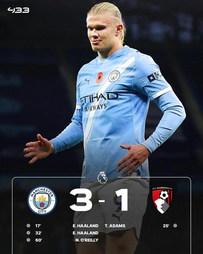 下半場,福登助攻,奧賴利突入禁區低射破門。最終,曼城3-1戰勝伯恩茅斯。