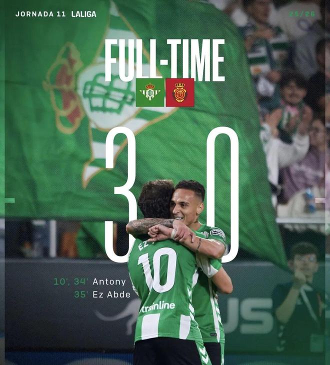 皇傢貝蒂斯3-0擊敗馬略卡,安東尼在本場比賽當中首發出場,他先是自己打進兩球,之後又助攻阿佈德打進一球,直接參與瞭球隊的全部進球。
