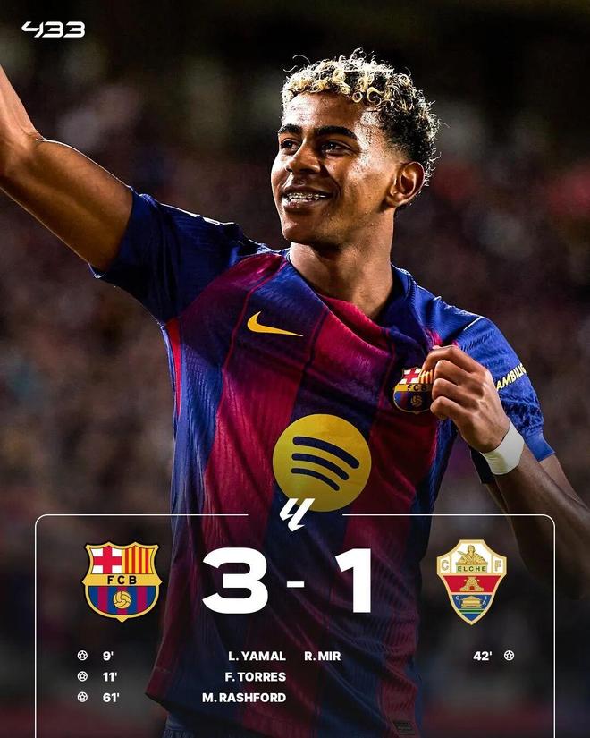 西甲第11輪,繼續進行,巴薩主場迎戰埃爾切。上半場,亞馬爾與費蘭三分鐘內接連破門,隨後拉法-米爾為埃爾切扳回一城。