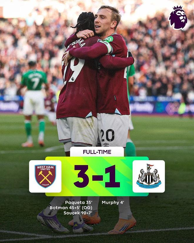 下半場傷停補時階段,紹切克補射破門為西漢姆聯鎖定勝局。最終,西漢姆聯在主場3-1逆轉戰勝紐卡。收獲3分的鐵錘幫,暫時以7分排在積分榜倒數第三位。