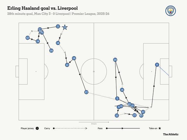 哈蘭德的頭球首開紀(jì)錄是一次傳統(tǒng)的邊路傳中加頭球攻門,但它源自一次長時間、流暢的傳球配合,這是我們本賽季很少見到的。這次配合涉及瞭曼城所有場上球員,展現(xiàn)瞭耐心、精準(zhǔn)和些許個人才華。