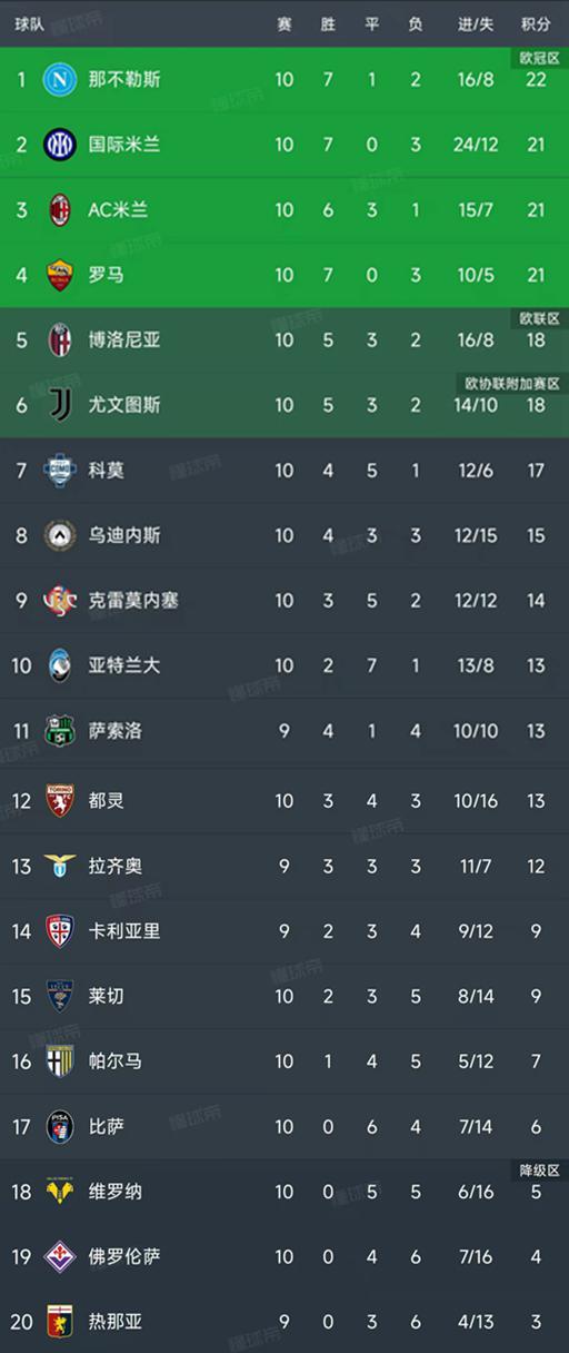 北京時(shí)間11月3日,意甲第10輪結(jié)束瞭8場(chǎng)比賽,最新積分榜如下!