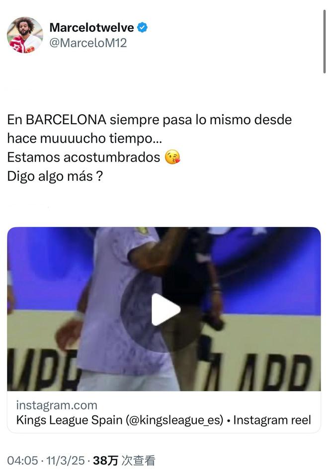 前皇馬球星馬塞洛近日在國王聯賽中因對裁判不滿,再次提及老對手巴塞羅那,引發球迷熱議。他在社交平臺發文稱“在巴塞羅那總是發生同樣的事情,我們已經習慣了”,引起廣泛討論。
