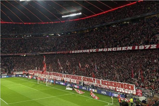 在拜仁對(duì)陣布魯日的比賽開(kāi)賽前不久,安聯(lián)球場(chǎng)的球迷們舉起了一條橫幅,上面寫(xiě)著“反對(duì)權(quán)力濫用以及在關(guān)系中的身體和心理暴力” 。