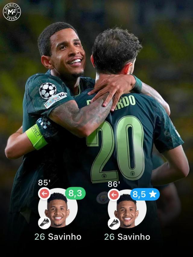 實際上,薩維尼奧的表現不止體現在助攻上。面對比利亞雷亞爾,他全場送出了5次關鍵傳球,5次成功過人,3次創造重大機會,并完成了全部5次嘗試過人,當晚只有哈蘭德的射正次數多于他,這在任何比賽中都是常態。《曼徹斯特晚報》稱這是他“代表曼城表現最好的比賽之一”,并給出了8/10的評分。