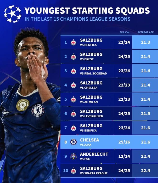 北京時間10月23日,切爾西在歐冠聯賽階段第3輪的比賽中主場5-1大勝10人作戰的阿賈克斯,吉烏、莫伊塞斯-凱塞多、恩佐-費爾南德斯、埃斯特旺以及泰里克-喬治分別進球。賽后根據德轉的統計,切爾西本場比賽首發陣容的平均年齡僅為21.6歲,為歐冠近15個賽季第8年輕。