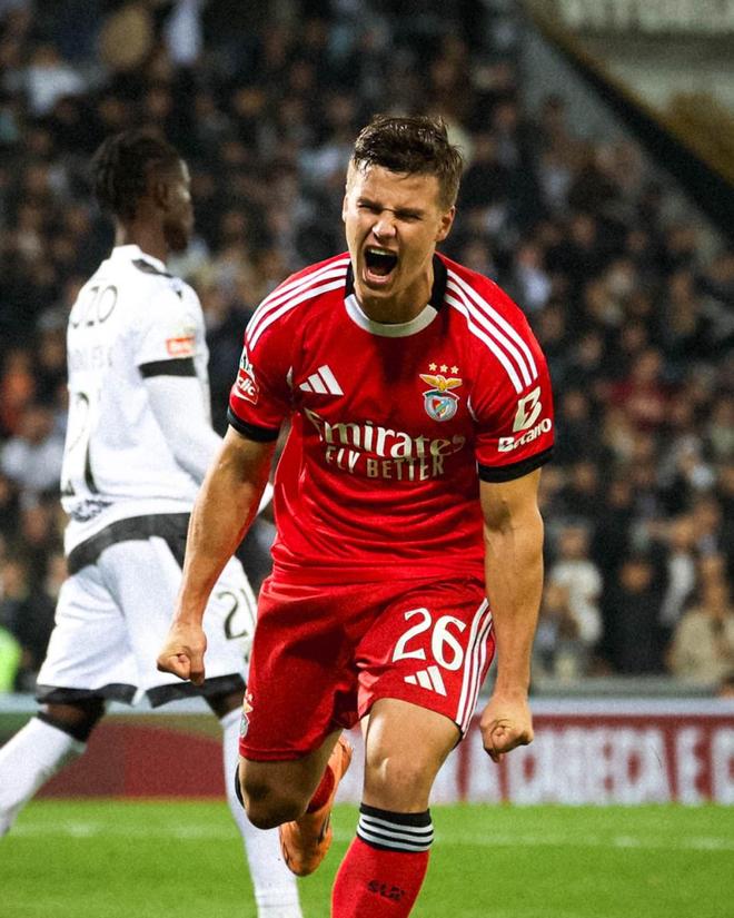 易邊再戰(zhàn),比賽僅僅開(kāi)打8分鐘,本菲卡就打破僵局。客隊(duì)開(kāi)出角球,托馬斯-阿勞霍在人群中高高躍起甩頭將皮球頂入遠(yuǎn)角,本菲卡1-0領(lǐng)先,取得了下半場(chǎng)夢(mèng)幻般開(kāi)局。